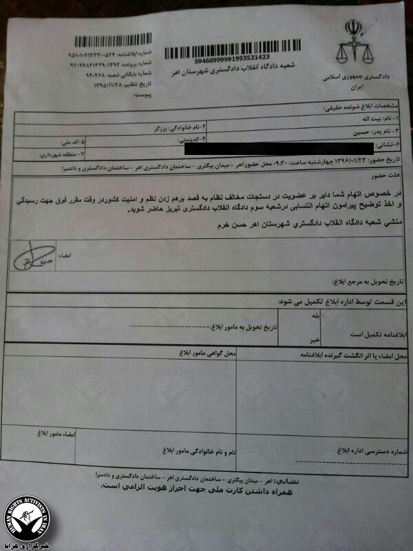 به گزارش خبرگزاری هرانا، ارگان خبری مجموعه فعالان حقوق بشر در ایران، بیت الله برزگر فعال ترک (آذری) با احضاریه «شعبه دادگاه انقلاب» دادگستری شهرستان اهر، بایستی «جهت اخذ توضیح پیرامون اتهام انتسابی» مورخ ۲۳ فروردین ماه ۹۶ درشعبه سوم دادگاه انقلاب دادگستری تبریز حضور یابد.