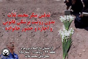 امروز پس از اجرای حکم اعدام “محمد ثلاث” درویش گنابادی، پیکر بی جان این درویش بدون حضور و اجازه خانواده، توسط نیروهای امنیتی از زندان رجایی شهر کرج به شهرستان بروجرد منتقل و دفن شد. خانواده این درویش گنابادی خواستار بررسی پیکر آقای ثلاث توسط پزشکی قانونی از باب آثار شکنجه هایی که این زندانی پیش تر مدعی تحمل آنها شده بود شدند که مورد موافقت مسئولان مربوطه قرار نگرفت.